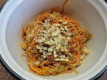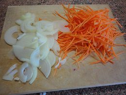 3. Нашинкуйте морковь соломкой, можно на "корейской" терке, как у меня. Лук нарежьте полукольцами.