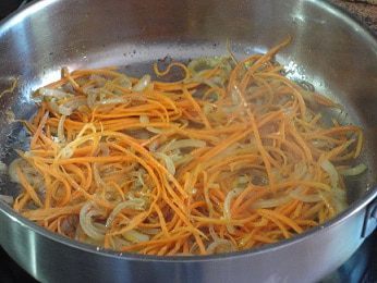 4. На разогретую сковороду влейте оливковое масло. Вначале обжарьте лук до золотистого цвета, затем добавьте морковью и слегка прожарьте, т.е. только до мягкости моркови.