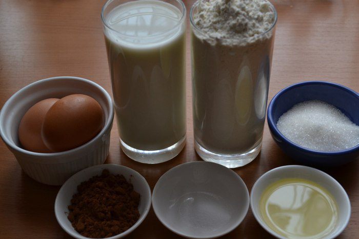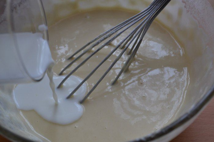 Когда тесто стало однородным, добавить оставшееся молоко. Перемешать. Если всё же есть комочки, можно использовать блендер или поработать ещё хорошенько венчиком.
