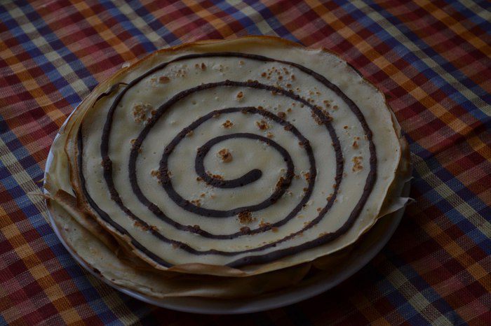 Блинчик берем спиралькой наружу, чтобы было видно, что они полосатые.