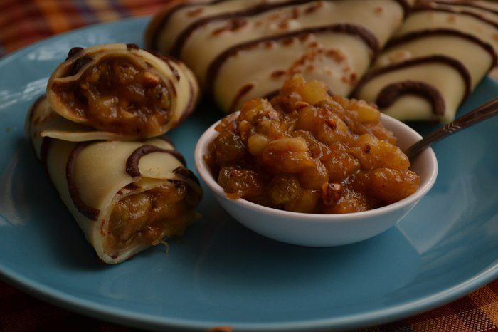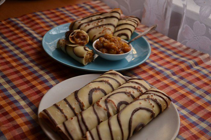 На край блина выкладываем начинку, сворачиваем в трубочку.