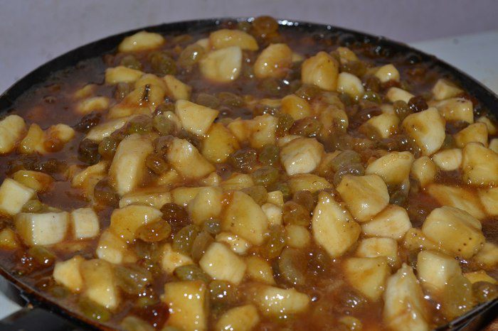 Когда получили золотистую карамель, добавим сливочное масло. Потом изюм с коньяком. Спирты испарятся и начинку можно давать детям. Добавить бананы, корицу. Не превращаем бананы в кашу! Добавим теперь обжаренные орехи (измельченные).