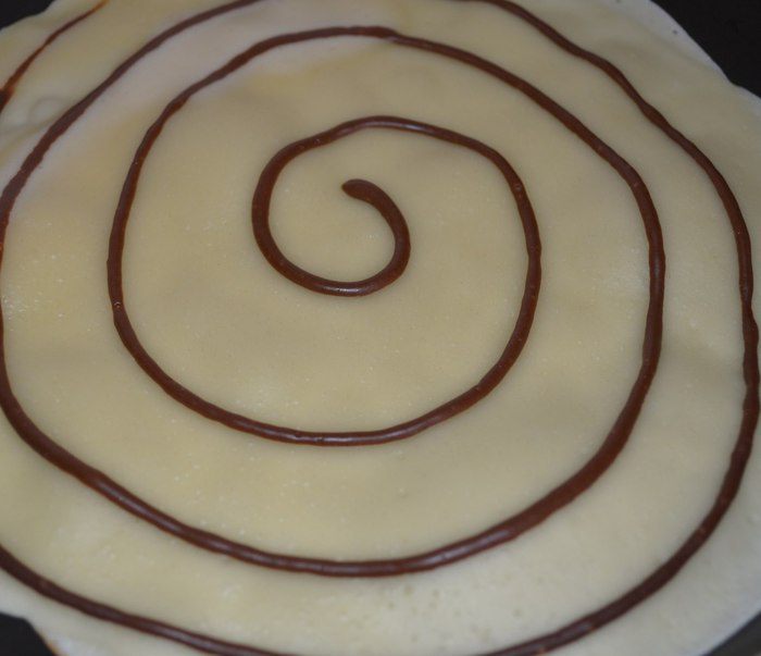 На сковороду наливаем белое тесто, шоколадным же делаем спиральки)