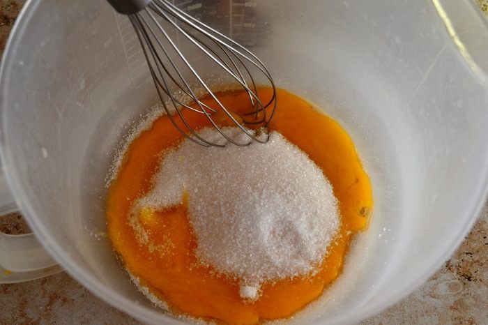 Отделяем желтки от белков и сахар взбиваем с желтками+ванильный сахар.
