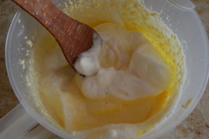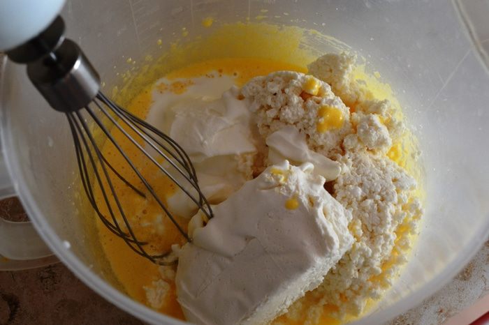 К яично-сахарной смеси добавляем остальные ингредиенты, всё хорошо взбиваем блендером (у меня было 200г зернистого и 100г творога в брикете).