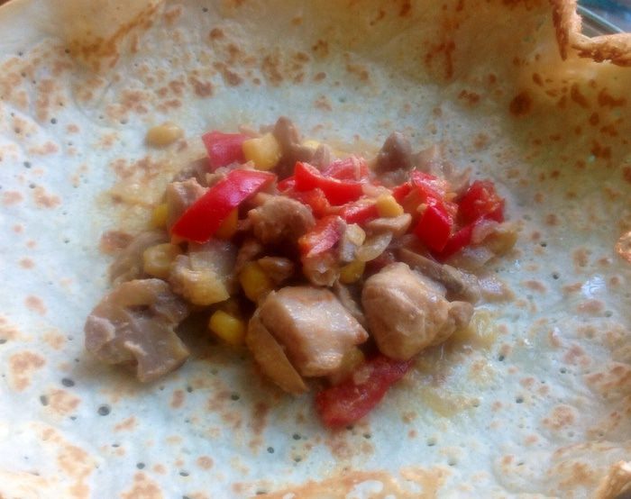 На растительном масле обжарили мелко порезанный лук, когда он подрумянился, добавили к нему куриные бедрышки, порезанные на мелкие куски и без кожи, затем порезанные шампиньоны, красный сладкий перец тоже порезанный, консервированную кукурузу. Все это посолили, поперчили на свой вкус.