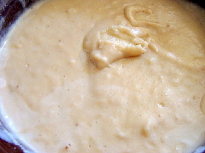 Бананы измельчить погружным блендером, добавить сметану и сгущенное молоко, ванилин и крахмал, перемешать.