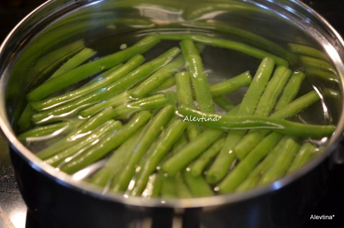 В кипящую подсоленную воду положить приготовленную фасоль, кончики отрезать, готовить ее примерно 3-5 мин.