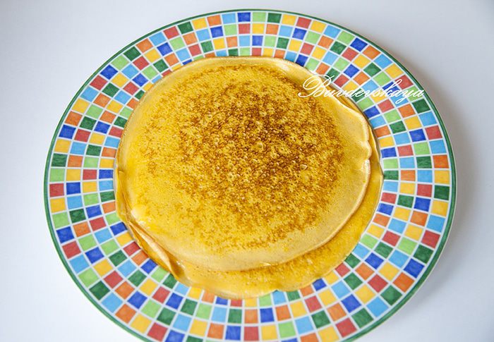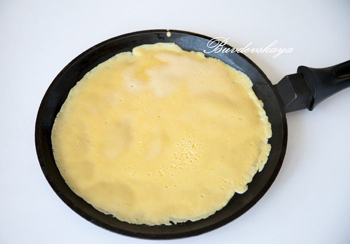 Раскалить блинную сковороду, смазать маслом. Вылить тесто на сковороду (чуть меньше стандартного половника) и распределить тесто по сковороде, наклоняя ее. Жарить блины следует на среднем огне. Когда блин с одной стороны равномерно покроется пузырьками - перевернуть его. Со второй стороны готовить блин всего 10-15 секунд.