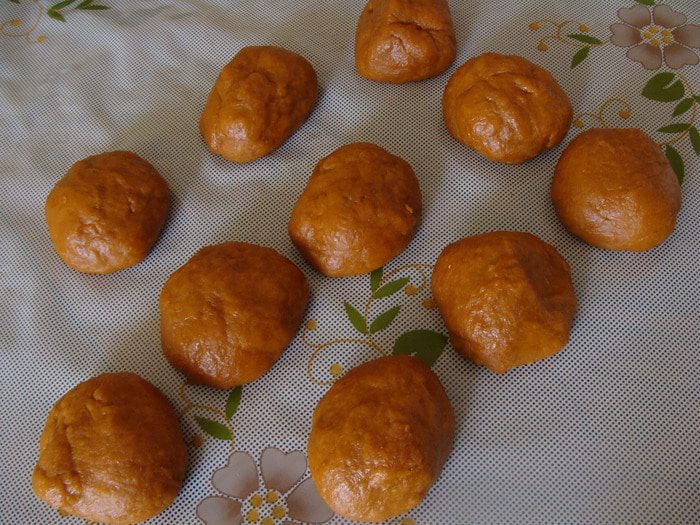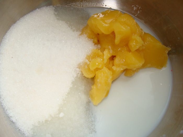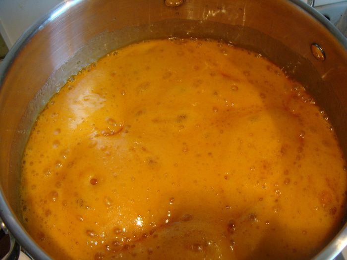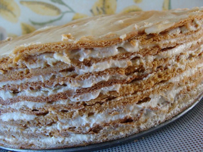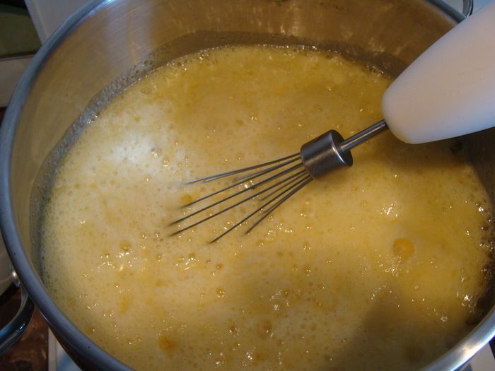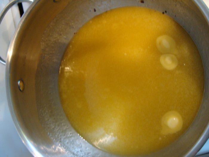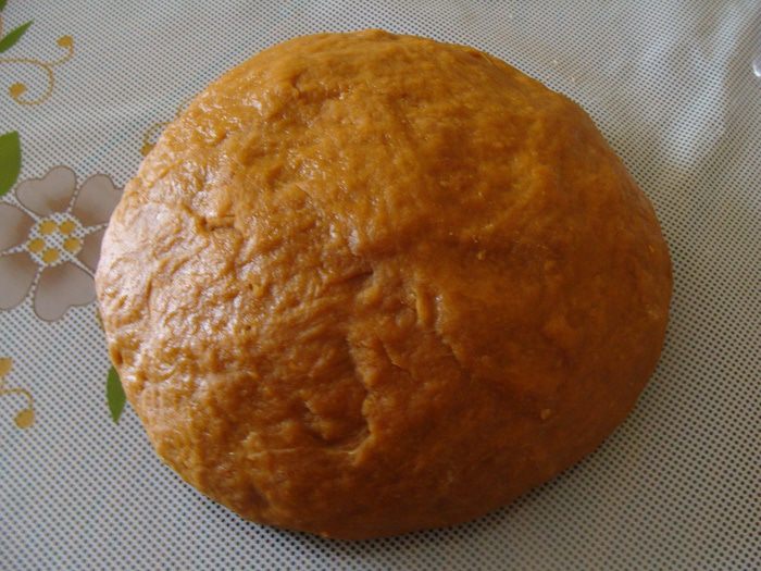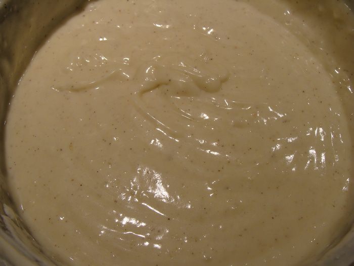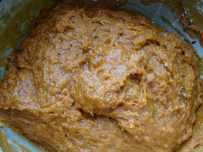 Снять с огня, продолжая помешивать. Масса потемнеет до сливочно-коричневого цвета. Когда немного остынет (минут через 5) добавим яйца по одному, каждый раз взбивая венчиком. Затем засыпем туда просеянную муку, добавляем пряности, получается негустое тесто, его мы накрываем пленкой и оставляем на 30 минут набухать.