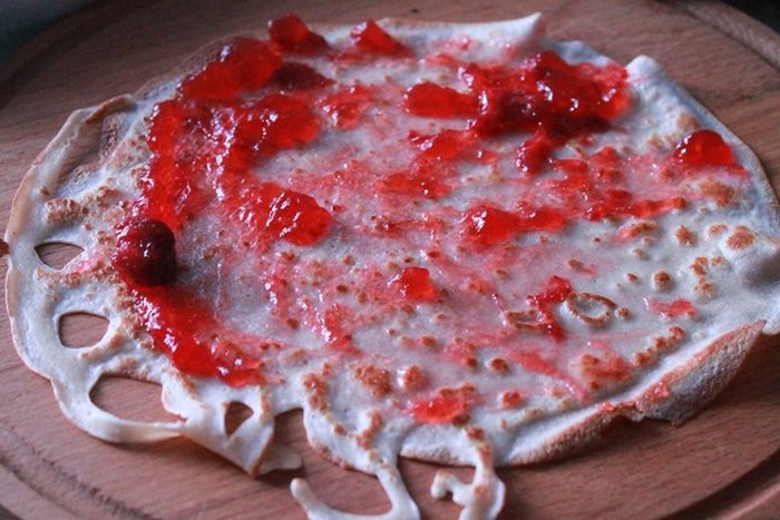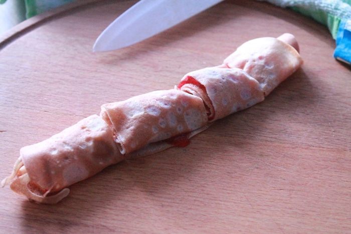 Каждый блинчик намазать конфитюром, скатать в рулет и разрезать на кусочки примерно 4-5 см.