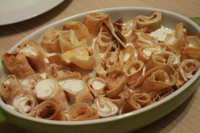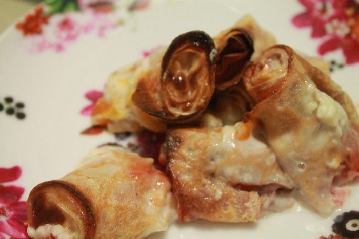 Залить сливочной смесью блинчики и выпекать в разогретой до 200 градусов духовке 20 минут.