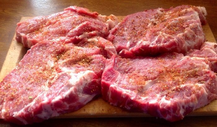 Отрезала достаточно толсто 4 стейка от свиной шеи, промыла, просушила бумажными салфетками, натерла солью и грузинскими специями (густо) для шашлыка.