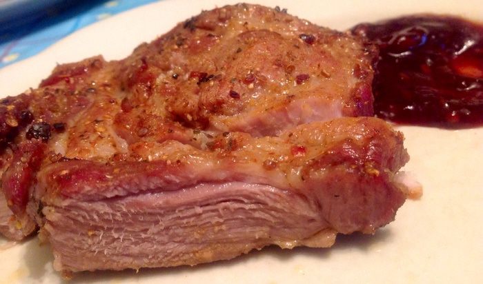 Я застелила обычный противень из духовки фольгой, поставила на него обычную решетку, предназначенную на горячих кастрюль (смотрите на фото), и жарила мясо таким вот образом, тогда жир вытекал, и получилась хорошая вкусная корочка