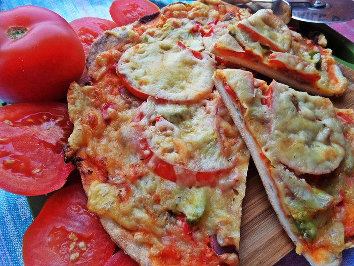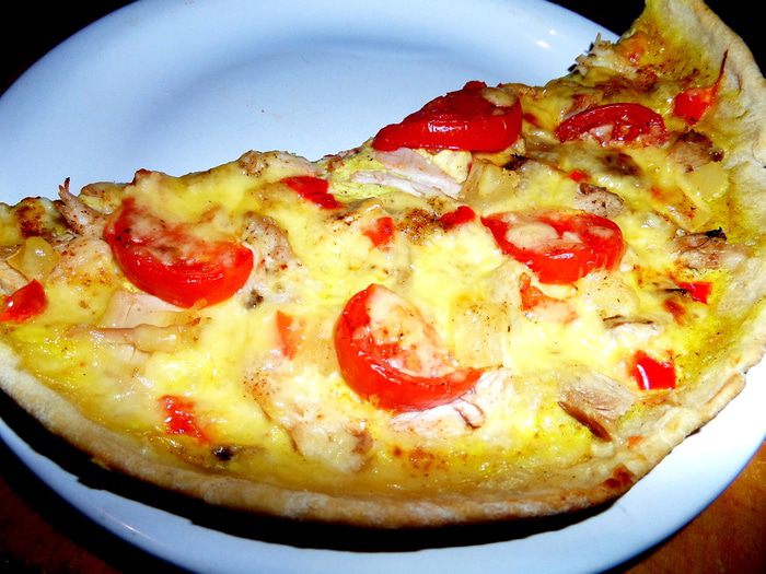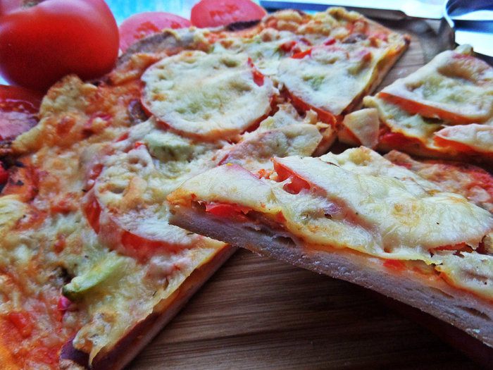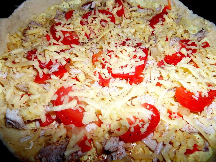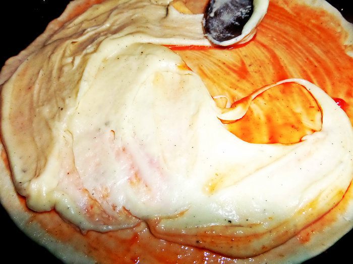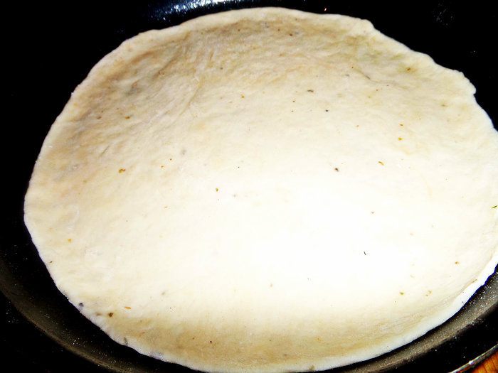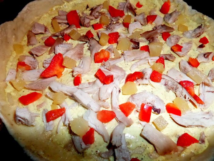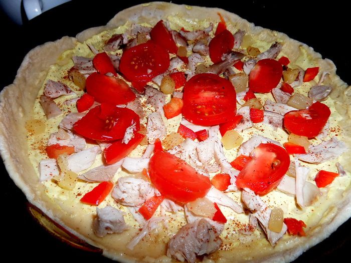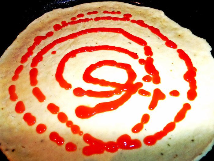 Для быстроты берём сухую смесь для теста (местное) специально для пиццы с итальянскими травами. Разводим смесь стаканом воды и даём постоять, накрыв. Теста хватает на 3 пиццы. Раскатываем тонко и переносим в смазанную тефлоновую форму 26 см в диаметре. Накалываем вилкой, чтобы не вздулось.