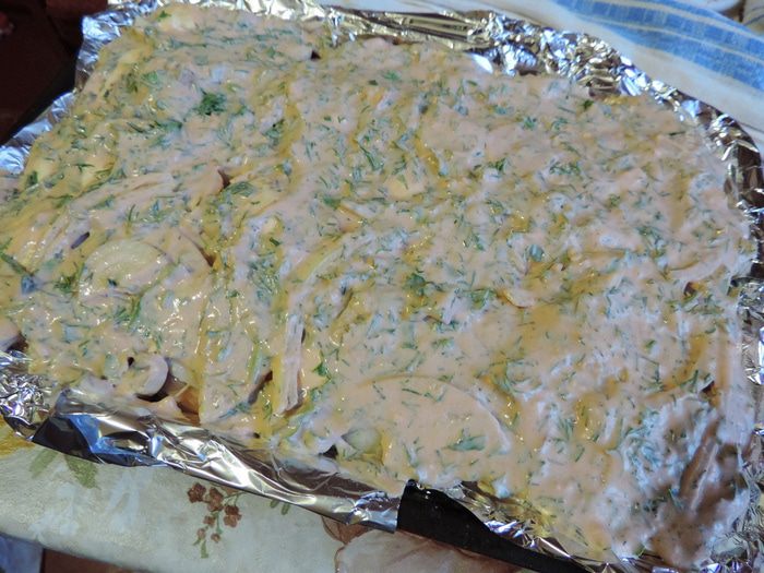 Для соуса сметану смешиваем с мелко нарезанной зеленью (у меня был смешанный пучок укропа и петрушки), томатной пастой и чесноком, пропущенным через пресс для чеснока. Все хорошенько перемешать, посолить по вкусу. Можно добавить чайную ложечку сахара.