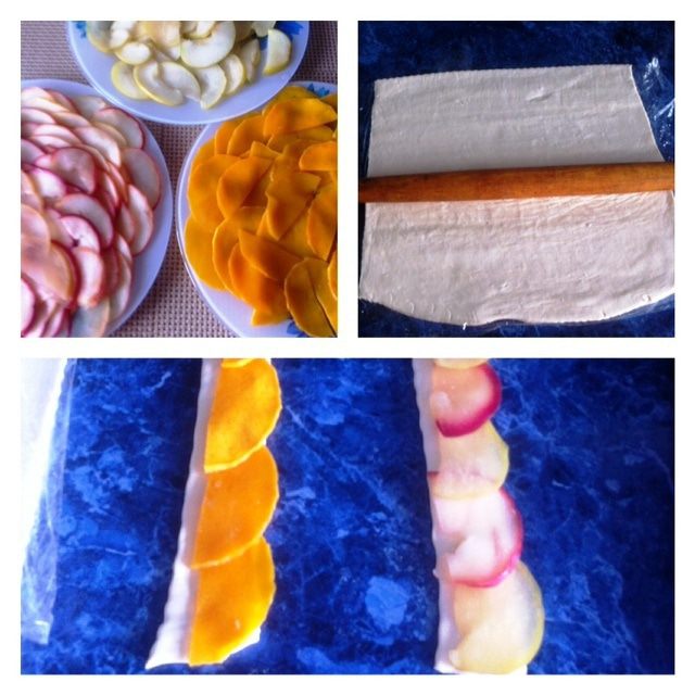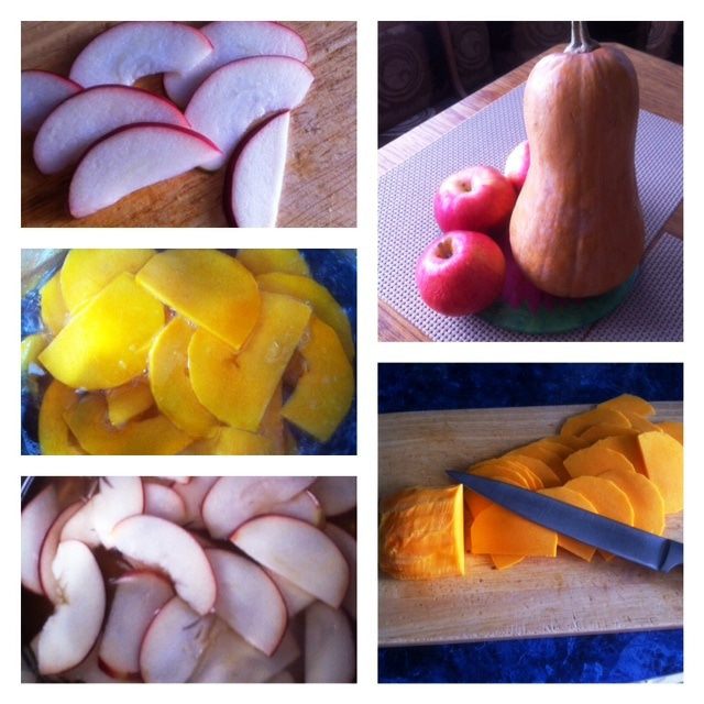 Очищаем тыкву, нарезаем тонкими пластинами по размеру как и яблоко.