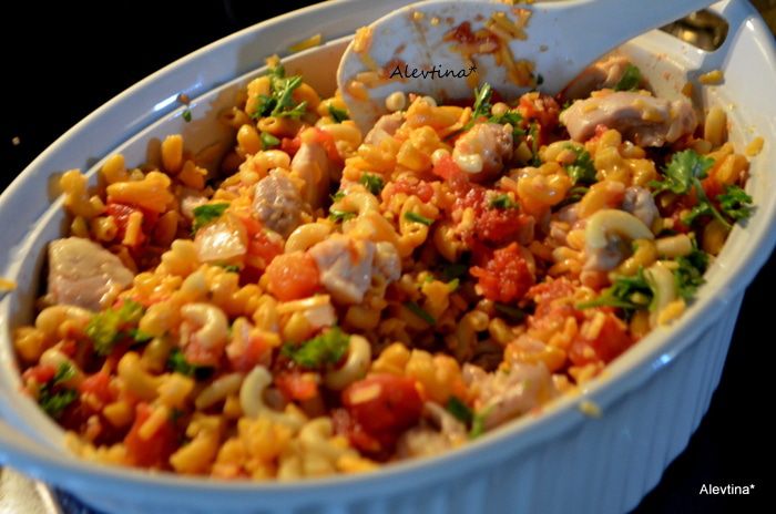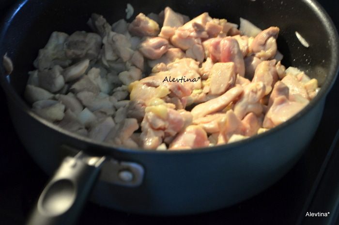 На сковороде разогреть оливковое масло, добавить порезанные кубиками куриные грудки или голень без кости и кожицы. Обжаривать примерно 3-5 мин., затем добавить мелко нашинкованный чеснок и луковицу, выход лука примерно 1/2 стакана. Готовить еще 5 мин.