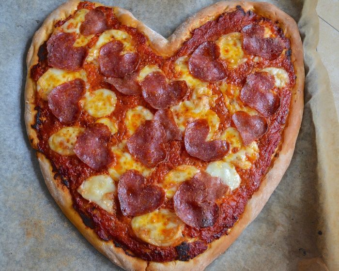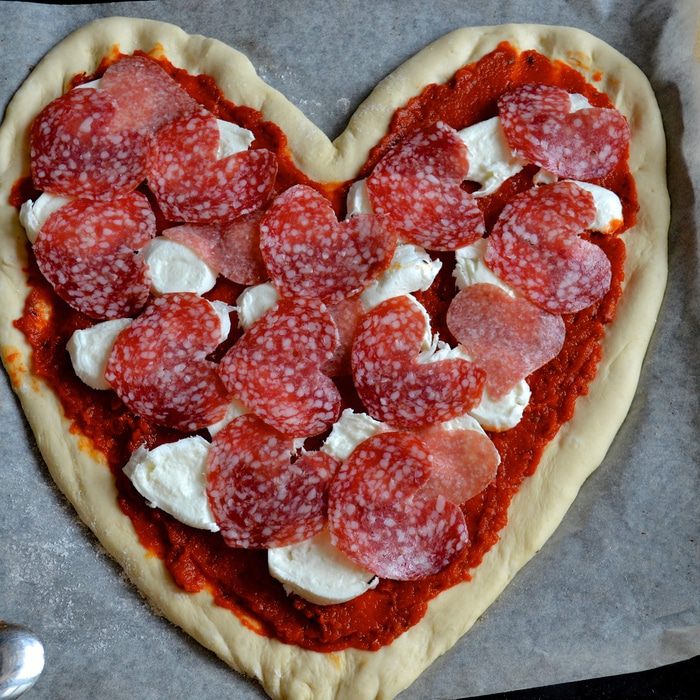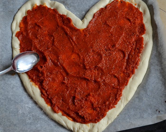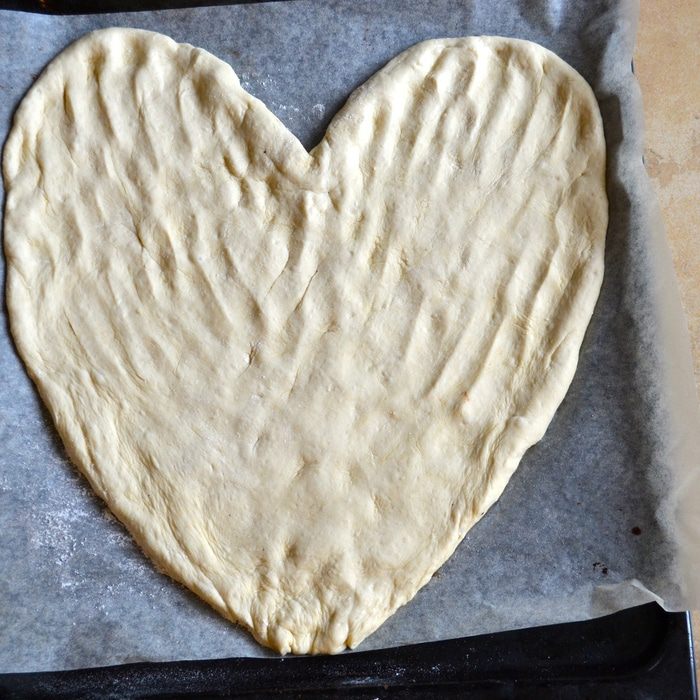 Готовое тесто обмять, перенести на противень, застеленный бумагой и, помогая себе руками, придать пицце форму сердца. Накрыть полотенцем и отставить на 10 минут.