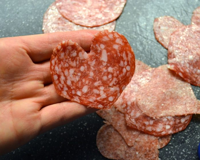 За это время вырезать из кружочков салями сердечки. Просто сложите каждый кружок пополам и придайте ему форму капли. Затем откройте, и у Вас получится...