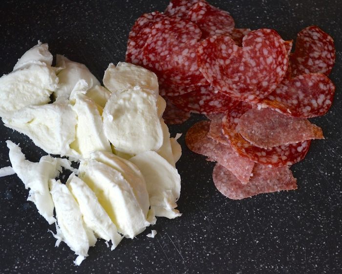 Сверху выложить кусочки моцареллы и салями.
