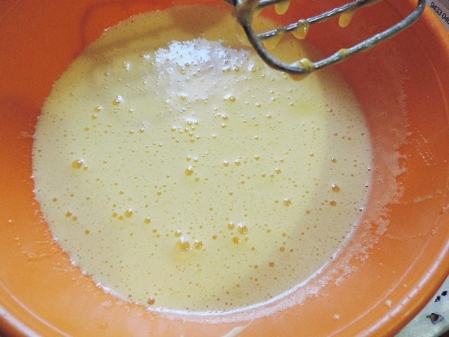 Добавляем размягченный при комнатной температуре маргарин. Взбиваем до однородности.