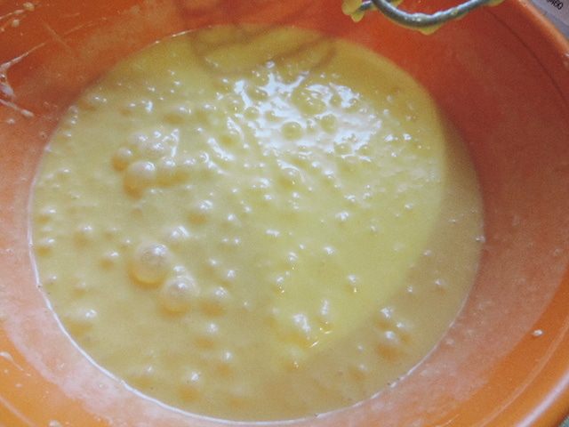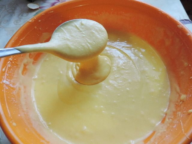 Теперь понемногу просеиваем муку и перемешиваем миксером на самой маленькой скорости. Получаем тесто по густоте как сметана.