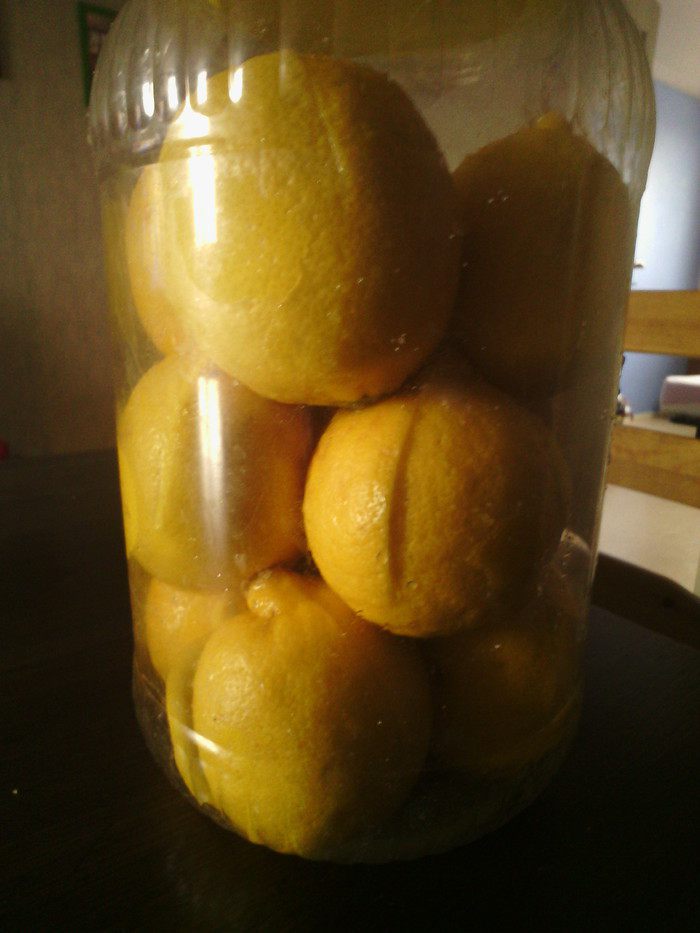 Лимоны выделят свой сок, периодически аккуратно переворачивайте банку обдавая соком все лимоны. Повторяйте это каждые 5-6 дней.