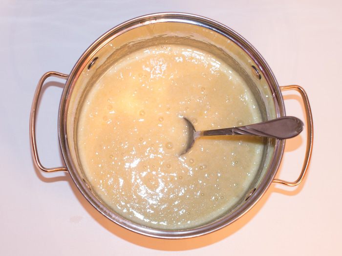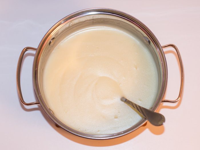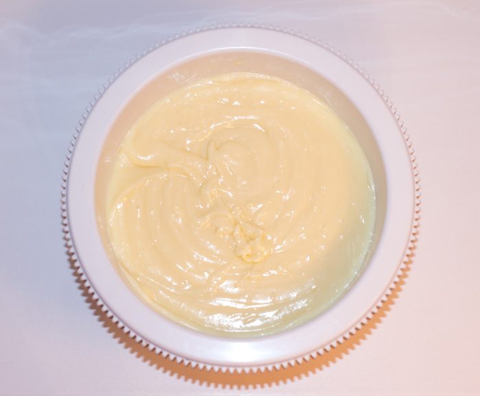 Варим крем на среднем огне постоянно помешивая венчиком, иначе крем подгорит. Варим до загустения. Сливочное масло (мягкое) взбить миксером, порционно добавляя заварной крем. Взбиваем до тех пор, пока не добавим весь крем и масса не станет однородной. Крем очень нежный по консистенции, но хорошо держит форму.