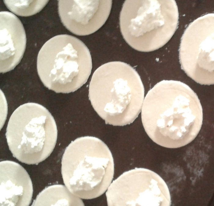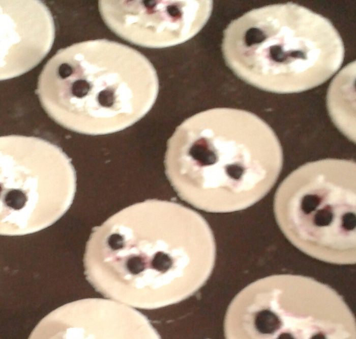Завернем плюшки, так как мы лепим пельмени (к сожалению нет фото этого шага). Затем выкладываем булочки на противень смазываем их желтком и запекаем в духовке при 180 градусах 20-25 минут. При запекании булочки немного раскроются и будут напоминать вытянутые губки, отсюда и название "поцелуйчик".