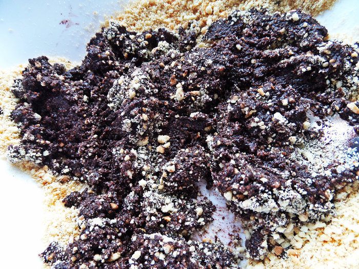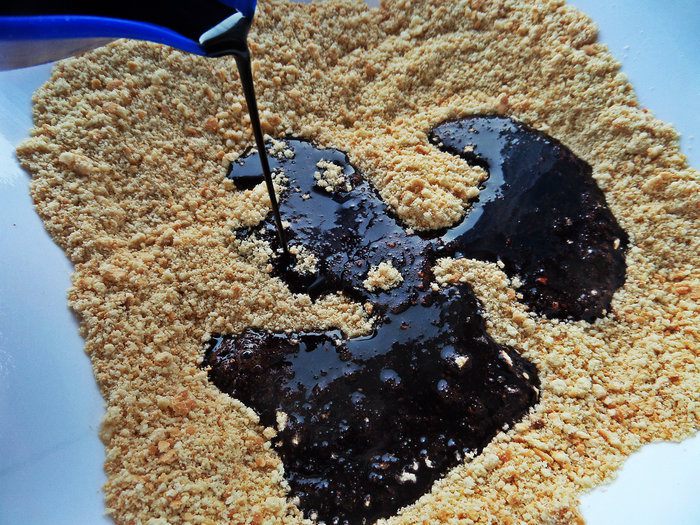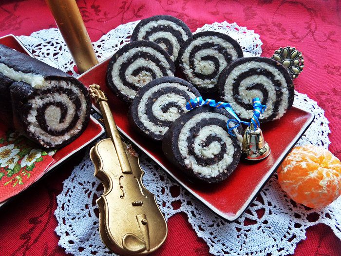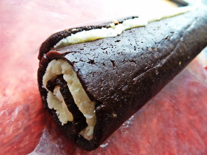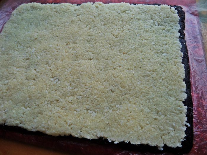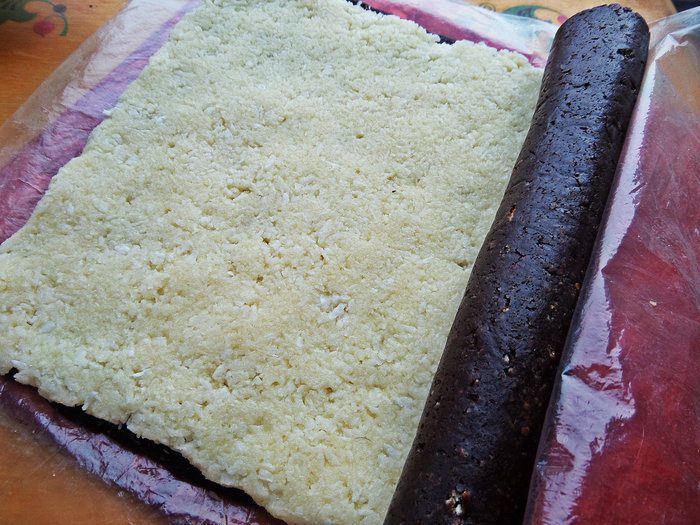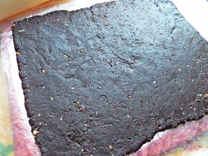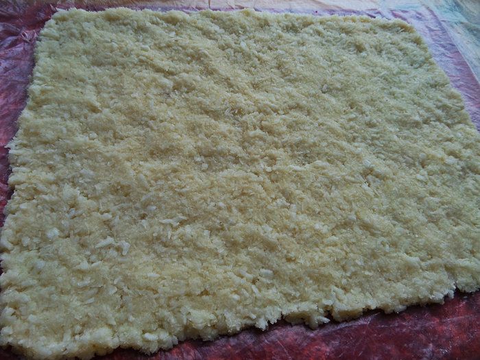 Мягкую тёплую массу разминаем по плотной плёнке, потом прокатываем слегка скалкой (если скалка пластиковая, за деревянную не ручаюсь, что не прилипнет!). Я нашла плотный пакет и разрезала его на две половинки, получилось 2 прямоугольника. Плёнку я на всякий случай смазала чайной ложкой растительного масла без запаха.