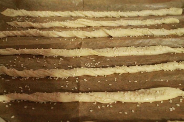 Смажьте каждый жгут разведенным в молоке крахмалом и присыпьте кунжутом.