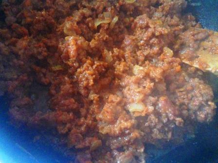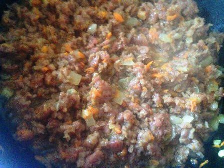 На растительном масле обжарить нарезанный кубиками лук, натертую морковь и мясной фарш до золотистого цвета.