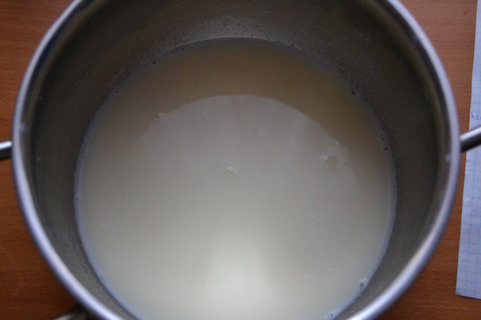 В ковшик/кастрюлю добавим сливки, сахар, ванильный сахар, молоко. Хорошо перемешаем. Ставим на средний огонь и доводим до кипения, после снимаем с огня. Теперь нам нужно добавить в эту смесь желатин и размешать, пока желатин не растворится.