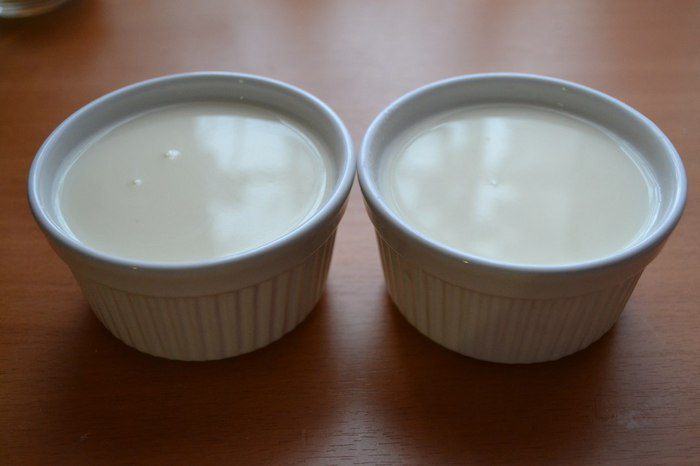 Когда будущий десерт остынет до комнатной температуры, наполним им формочки (до того как залить, формочки можно промыть холодной водой для того, чтобы лучше достать десерт). Теперь убираем в холодильник минимум на 3 часа.