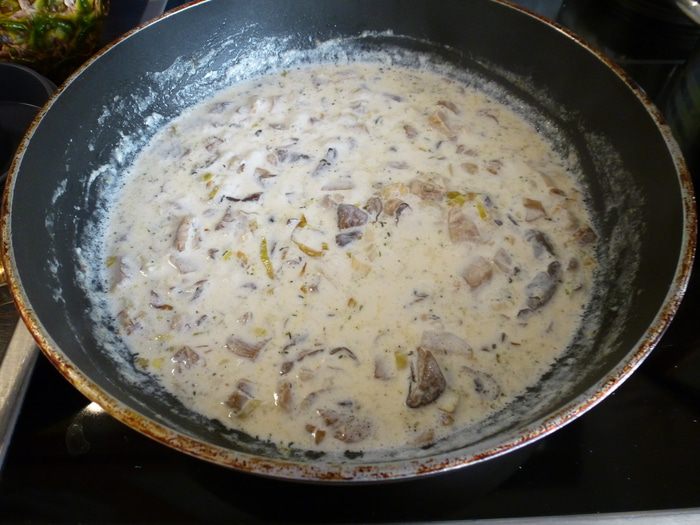 Добавляем сливки, листики тимьяна, солим, посыпаем итальянскими травами ( или другими, на ваш вкус) и тушим 10 минут. За это время соус немного выпарится.