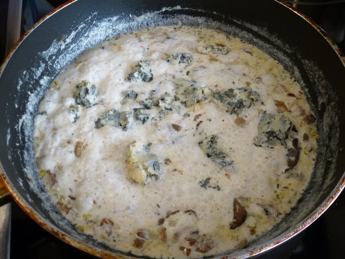 В соус крошим сыр Дор блю. Помешивая, ждем, когда растворится сыр. Грибной соус к спагетти готов.