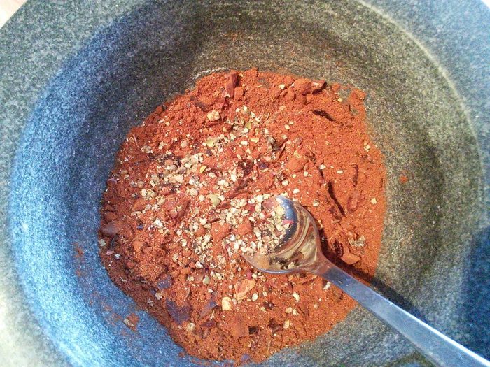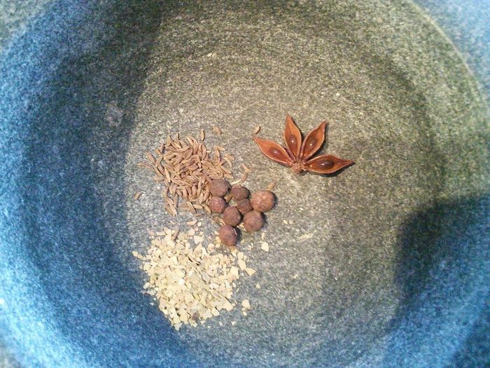 Подготовить специи, размолоть в ступке в порошок. От себя я добавила по щепотке тмина и молотого лаврового листа.