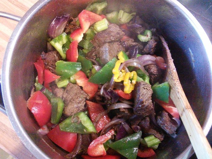Овощи добавить к мясу. По желанию добавьте острый свежий чили.