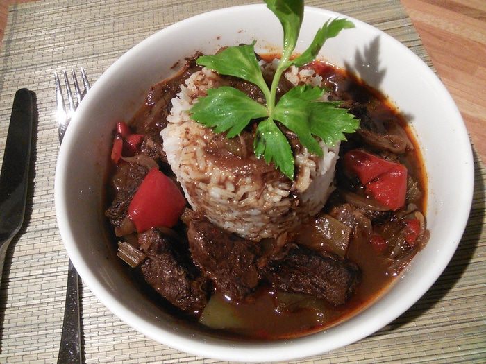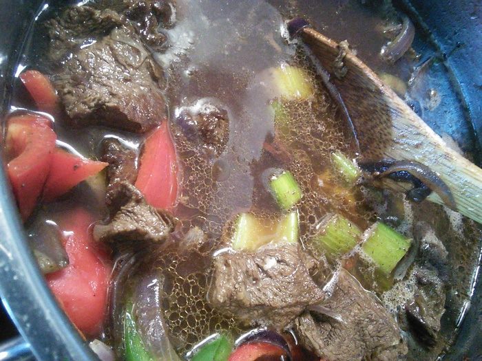 Влить вино, бульон и гранатовый сок. Я выдавала сок из одного крупного граната. Добавьте смесь специй и тушите мясо до его готовности. Мне хватило 1 часа.