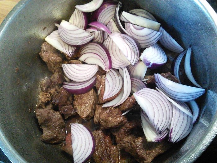 Красный лук, его кстати можно заменить на белый, порезать полукольцами и обжарить с мясом.