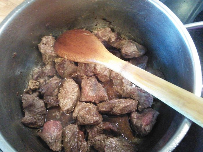 В кастрюле разогреть оливковое масло, обжарить мясо после мытья и нарезки на порционные кусочки со всех сторон до золотистого цвета.