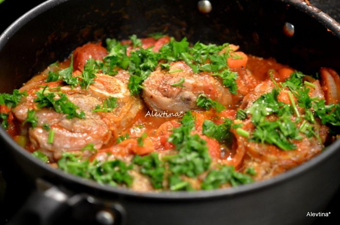 Традиционное блюдо итальянской кухни.Для рецепта требуется порционные кусочки мяса с костью, как голяшка, которые идут в специальной нарезке для этого блюда. Другие куски мяса не подойдут.