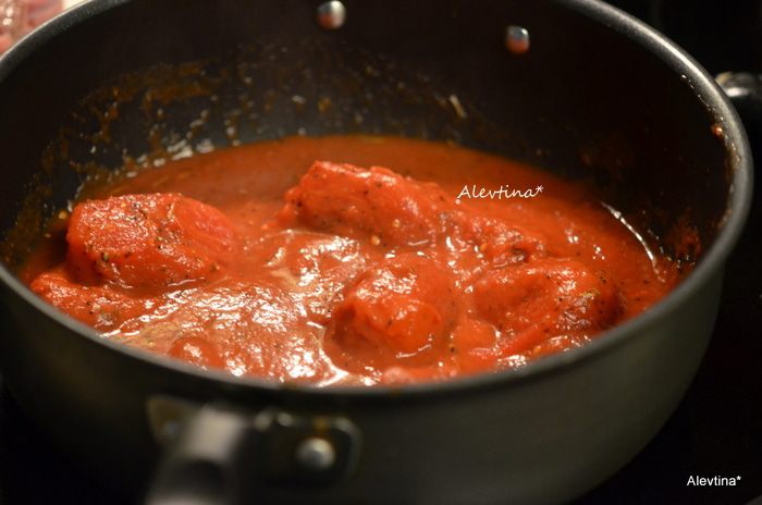На сковороду добавить вино, затем баночку томатов в соку, томатную пасту, базилик, розмарин, красный перец, довести до кипения. Убавить огонь и тушить 10 мин.
