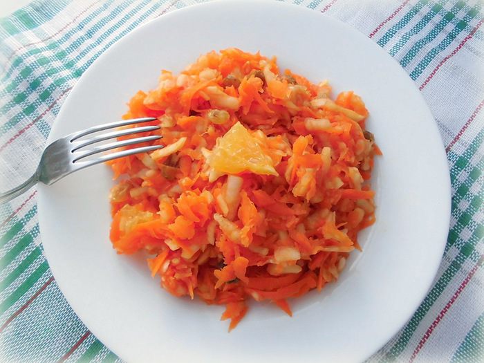 Добавить апельсин к остальным ингредиентам, положить мёд по вкусу. Перемешать. Все, салат готов! Единственное, лучше дать ему настояться, тогда все ингредиенты пропитаются соками и ароматами, и получится очень вкусно! Например, можно приготовить этот салат вечером, а есть утром. И еще - вкуснее, когда он немного теплый.