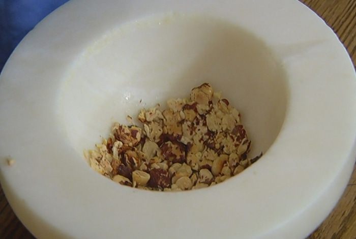 Обжаренные орехи измельчить в ступке так, чтобы остались крупные кусочки.