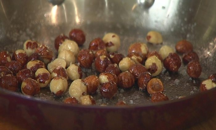 Разогреть в сковороде оливковое масло, всыпать оставшуюся соль, добавить фундук и обжарить орехи до золотистого цвета.