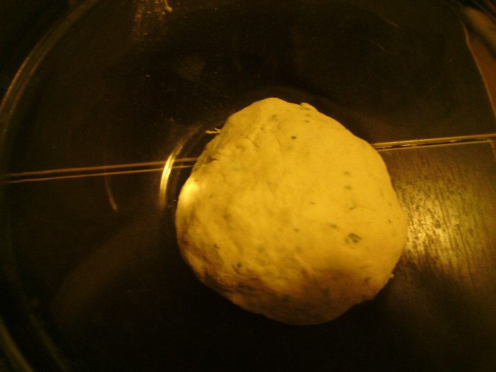 В глубокой посуде смешать все ингредиенты: сыр натереть на мелкой терке, лук покрошить (можете использовать сушеный). Замесить тесто, накрыть пленкой и оставить на 40 минут.
