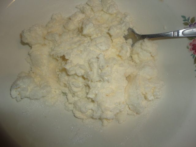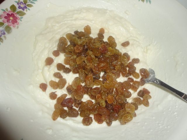 Изюм промыть, залить кипятком, слить и добавить в творог.