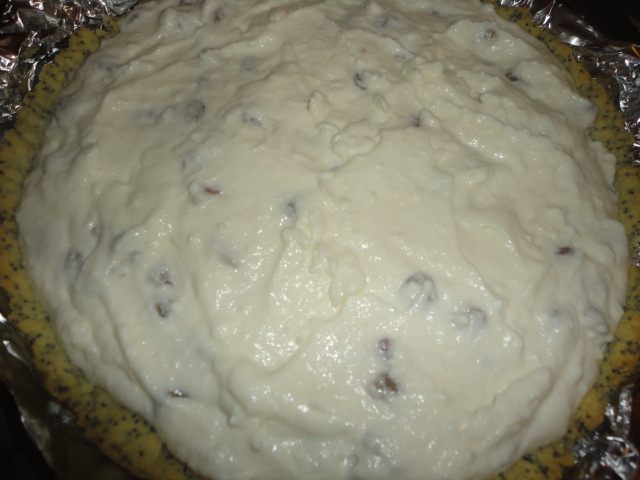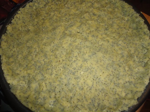Из сливочного масла, желтков, разрыхлителя и муки вымесить песочное тесто. Добавить мак. Раскатать тесто по периметру формы и поставить в духовку, предварительно нагретую до 200 градусов на 15 мин.